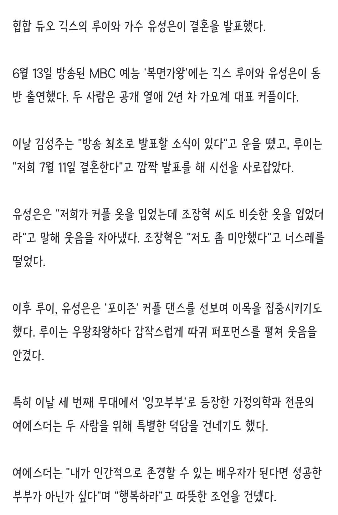 여시뉴스데스크긱스 루이♥유성은, 2년 열애 끝 결혼 여에스더 주례 모시고파(복면가왕)어제tv.