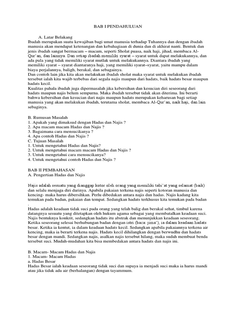 Pai Kelas 7 Bab 5 Hadas Dan Najis Pdf from imgv2-1-f.scribdassets.com Perihal bersuci meliputi beberapa perkara berikut: Suci dari hadas dan najis. Suci dari hadas ialah dengan mengerjakan wudhi', mandi dan tayammum. Kebersihan diri dan tubuh badan daripada hadas, kekotoran dan najis untuk menjamin kesejahteraan hidup dan amal ibadat diterima allah s.w.t. Ini dengan melihat bahawa tiada dalil yang menjadi pemutus akan perlunya untuk berwuduk dan menghadap kiblat. Haji ialah berangkat ke baitullah untuk menunaikan ibadah yang Pengertian, syarat, rukun, sunah, hukum, larangan, macam, cara, dalil dan hikmah. Suci dari najis ialah menghilangkan najis yang ada di badan, tempat dan pakaian.